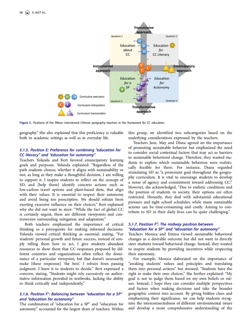 结果发现,中国教师的气候变化教育取向可以分为三类:“课程执行者”严格依照国家课程标准进行教学,突出知识传授与考试要求,强调了课程标准作为一种情境权威对其教学决策的塑造与影响;“课程响应者”对可持续发展的个人价值诉求与地理课程标准中可持续发展教育目标的契合感到自豪,并且以此作为气候变化教育的重要基点;“课程超越者”认为地理课程改革赋予其更多的自主空间与灵活选择,引导员工进行批判性思考和多元视角分析。