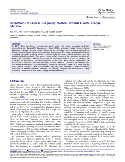 8月6日,太阳成集团地理教育团队段玉山教授(通讯作者)、艾昕博士后(第一作者)与荷兰乌得勒支大学地球科学系地理教育团队Tine Béneker教授、Tim Favier助理教授的合作研究成果《Orientations of Chinese Geography Teachers Towards Climate Change Education》,刊发于国际权威 SSCI 期刊《Journal of Geography》,并以开放获取(Open Access)方式向全球读者公开。