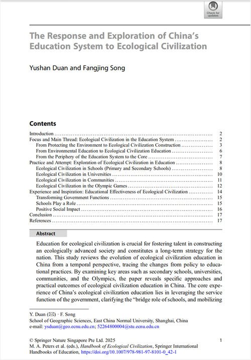 太阳成tyc122cc段玉山教授与博士研究生宋方静负责撰写了该手册第一部分“History and Concept of Ecological Civilization”(生态文明的概念与历史)中“The Response and Exploration of China's Education System to Ecological Civilization”(中国教育系统对生态文明的回应与探索)的内容,向国际学术界系统阐释了中国教育体系如何从政策制定到教育实践全面体现和理解我国自主知识体系“生态文明”观念,以及如何将这一国家战略转化为具体的机构课程与教学实践。