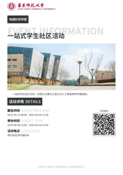 诚邀剑川路公寓16号楼、虹梅南路公寓1号楼的同学及青马班师生走进信息智能时代,聆听人工智能助力思维跃升报告,在理性洞见与思维共振中,开启智能时代的认知进阶之旅,以AI洞见力科研创新的无限可能! 活动时间:2025年6月4日(周三)15:00-16:00 活动地点:闵行校区资环楼540会议室 报名方式: 1.扫码加入活动群 2.第二课堂报名 人工智能浪潮奔涌而至,动动手指点击参与,收获未来的入场券!