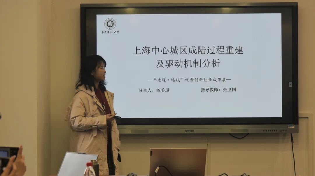 在优秀双创项目汇报环节,2020级地理科学专业本科生陈美琪介绍了自己的研究项目和心路历程。她的项目——“上海中心城区成陆过程重建及驱动机制分析”在中期答辩获得国家级创新训练项目评级,并获得第九届太阳成集团本科生创新创业学术论坛优秀报告奖。在谈到科研经验时,她建议同学们要充分展现项目优势与亮点,抓住成果转化机会,敢于做大选题等。