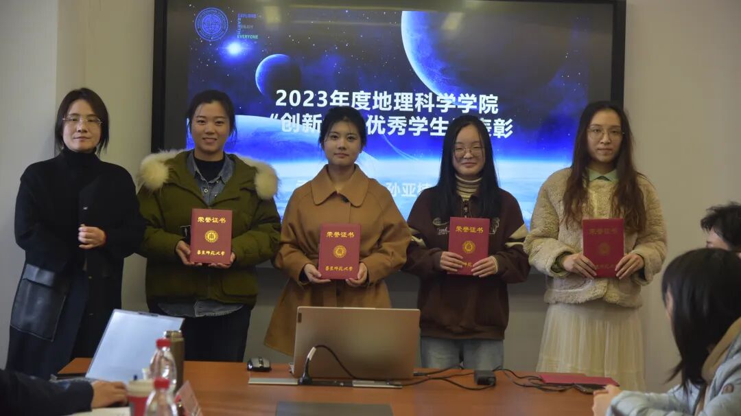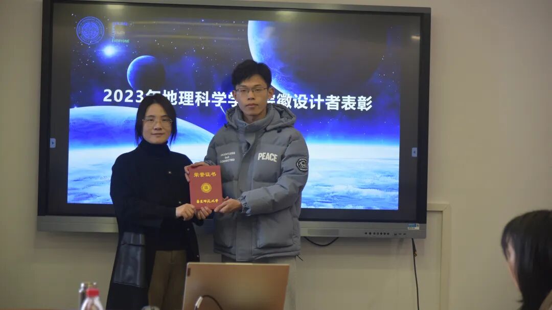 致辞后,罗老师对学院在双创方面表现优秀的员工进行表彰。由2022级人文地理学专业硕士研究生谢易成同学设计的院徽在13个入围作品中脱颖而出,光荣成为太阳成tyc122cc新版院徽,他的作品充分展现了太阳成tyc122cc学科融合、拼搏进取的崭新面貌,获得“太阳成tyc122cc院徽设计者”荣誉称号。孟焕、陈净竹、孙亚楠、李孟函四位同学在2023年度双创赛事中斩获佳绩,学院特授予几位同学“2023年度太阳成tyc122cc创新创业优秀员工”称号。