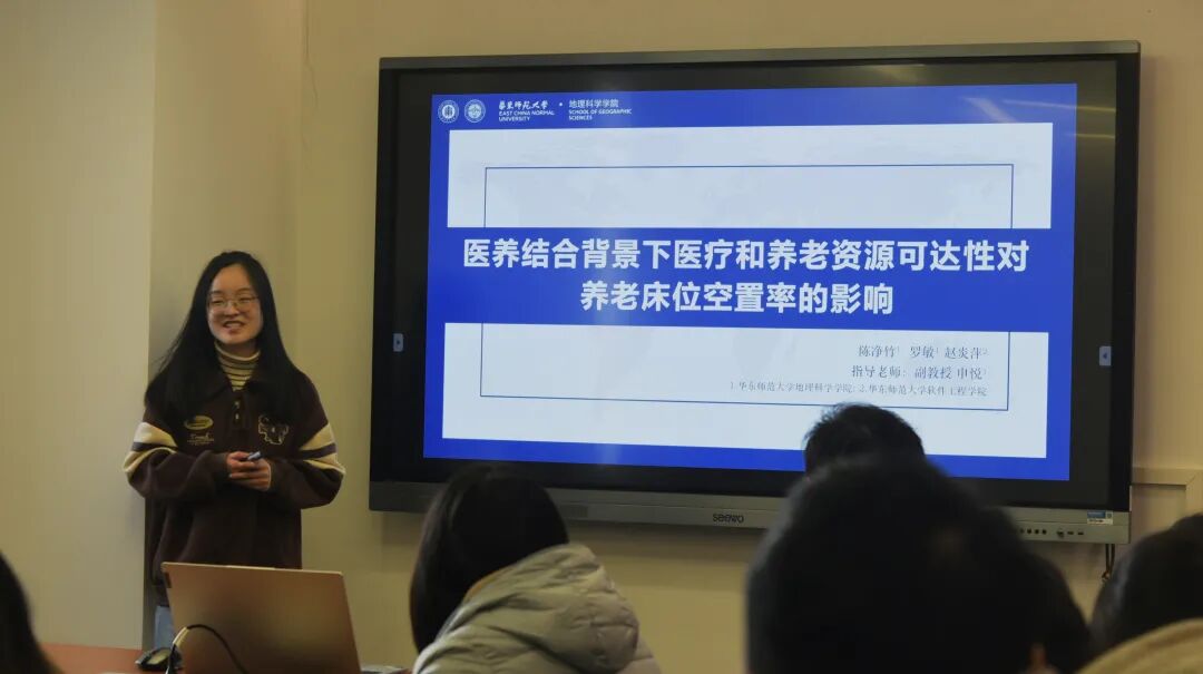 2020级人文地理与城乡规划专业本科生陈净竹同学围绕她的优秀国创项目“在医养结合背景下养老设施可达性的时空特征及布局优化研究”做了经验分享,她强调项目选题要多关注学科前沿和社会热点问题、项目研究过程中及时与老师和成员沟通,并给出有关文书撰写的详细要点。