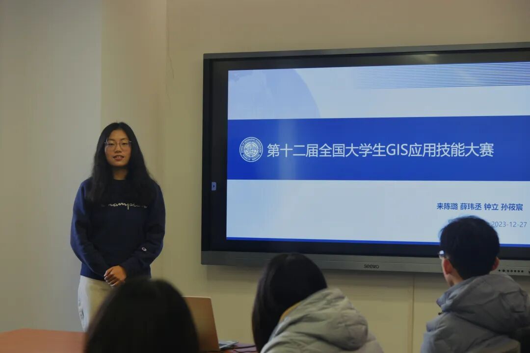 在第十二届全国老员工GIS应用技能大赛中,2021级地理科学专业(拔尖班)的来陈璐同学与本校的薛玮丞、钟立、孙筱宸同学在余柏蒗老师和黄艳老师的共同指导下,斩获大赛特等奖。来陈璐同学从比赛介绍、赛前准备、比赛体会三个方面分享她的经验,她建议同学们要有扎实的专业基础;平时多融会贯通,培养解题灵感;比赛时团队协作,分工明确;比赛心态要积极,竭尽全力不放弃等。
